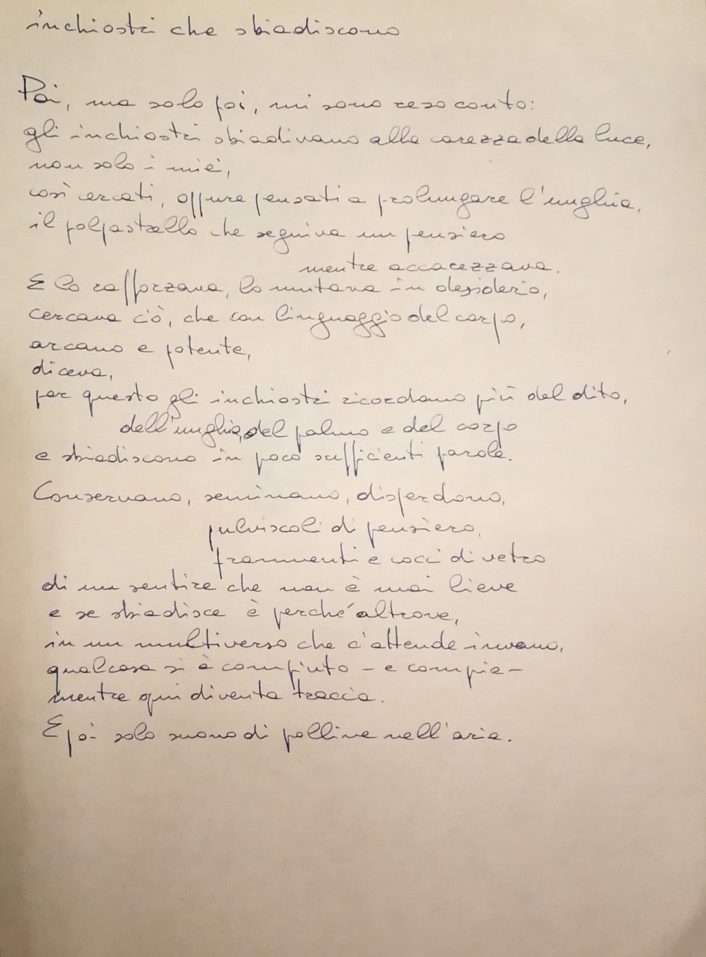 Scrivo con inchiostri che sbiadiscono. Come i ricordi, i pensieri che non si tengono, le amicizie stinte dalla lontananza. È stato naturale farlo, cioè senza ricerca o fatica. Cosa conserviamo di ciò che siamo, cosa raccontiamo agli altri che dica ciò che conta? Assomigliarsi sempre, rispettare l’avversario che ci accompagna, capire ciò che oggi conta e conterà domani. Il passato e le parole per dirlo sbiadiscono ma non se ne vanno, lievitano e germinano nuovi fiori.