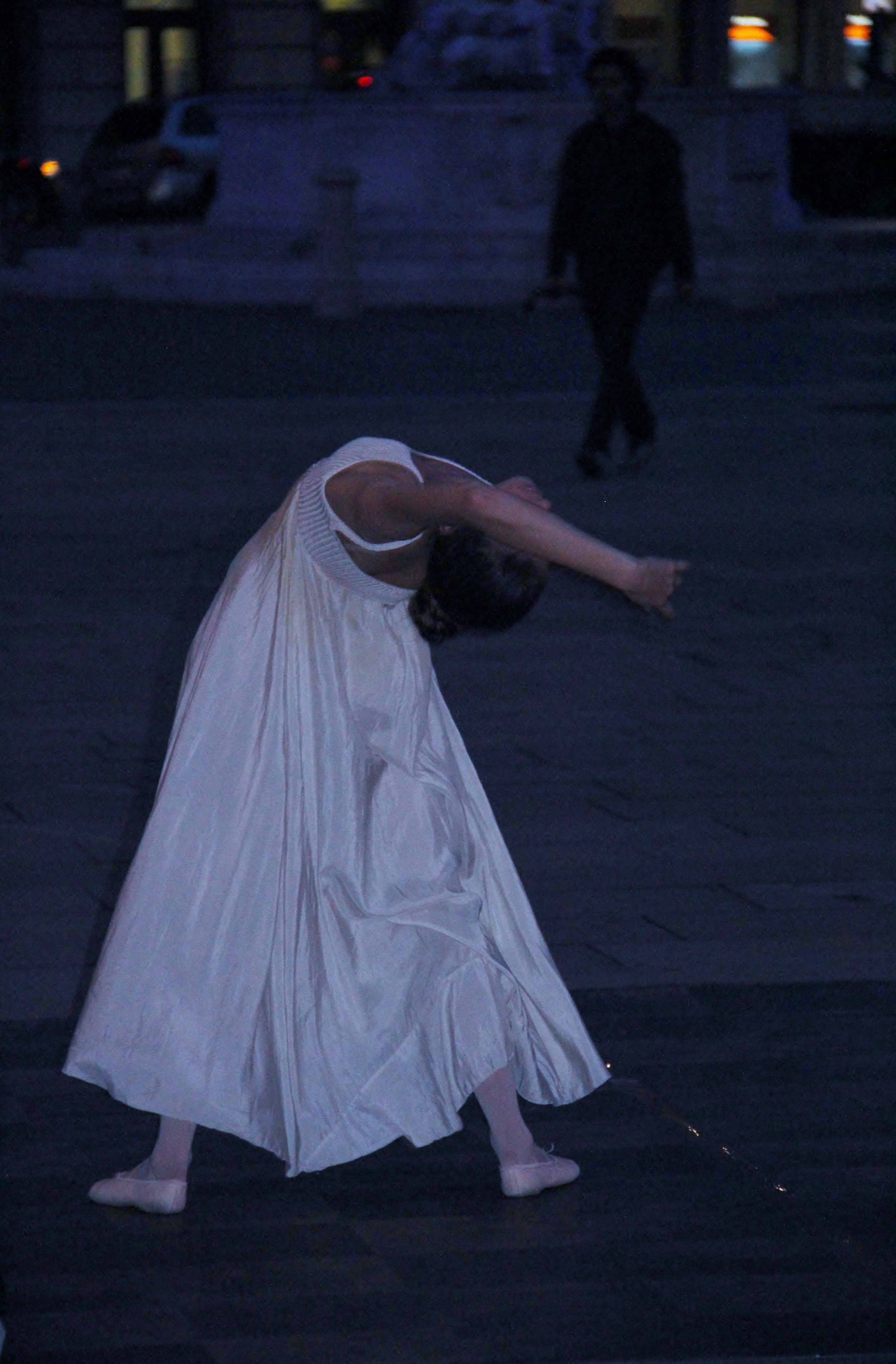 Trieste era una capitale senza regno, un coacervo di genti, sarà per questo che tra gli ultimi sprazzi di luce, emerge la bellezza violenta di edifici e manufatti deserti, apparentemente senz’uso. Non c’è un passeggio stasera, la pioggia l’ha spazzato con piccole raffiche di scirocco. C’è solo bellezza di pietre ordinate, di luci, di calore che trapela dalle vetrine dei negozi, dei buffet, dei ristoranti, dei caffè famosi. E c’è solo bellezza nel gesto d’una bianca ballerina di strada che prova i suoi passi nella piazza. E’ avvolta nel suono di un violino, accordato un po’ approssimativamente e si muove, in questa oscurità che cresce, leggera, muta e perplessa. Come il vento.