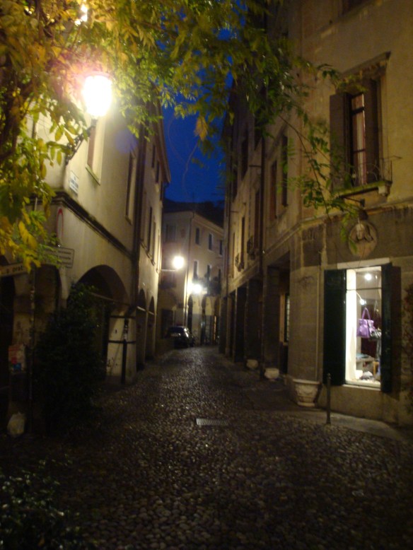 Quest’aria è così ricca di profumi, di colori accesi e sapori, che l’inverno sembra lontano. Sotto i portici del ghetto e del prato, ci sono ancora i bar con tavolini all’aperto pieni di ragazzi, e sul liston e tra le piazze si celebrano i riti vecchi e nuovi dello spritz, della vasca (ovvero del percorrere ininterrottamente il percorso dell’appuntamento serale), del parlare di tutto e di nulla fino a notte, con un bicchiere in mano. E’ bella la città in autunno, le prime nebbie velano il prato, ma basta alzare gli occhi e le stelle e la luna sono limpide. Ormai le nebbie dense della mia infanzia, sono un’eccezione; merito del riscaldamento delle case, dicono. Effettivamente dai colli, la città sembra avere un cuscino di calore sulla testa fatto di vapori e luci gialle: rimedi all’artrosi di una vecchietta accogliente, con qualche acciacco, ma con il fascino immutato di quando ci pareva giovane. Anche adesso riesce a stupirmi, a mostrarmi una strada mai percorsa, un giardino dentro un vicolo, il ricordo d’un fatto su una lapide che riporta a fasti antichi. Qui l’autunno dolce è di casa perché questa città ha questa stagione sulla pelle e nel cuore. Saprà agghindarsi di verde e fiori, a primavera, riempirsi di neve d’inverno, mostrando un temperamento nordico che non ha più negli occhi, arroventarsi d’estate e scacciarci verso il mare e i monti vicini, ma la sua stagione è l’autunno.